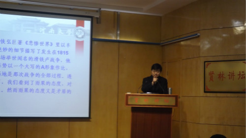 李伟昉教授首先对《悲惨世界》作了简要介绍。他指出,该书作者雨果表面上讲述了主人公冉阿让与警长沙威二人之间长达数十年的追踪逃捕,实则以此为线再现了波澜壮阔的法国大革命,铺展了那个时期下层人民坎坷苦难的生活图景。随后,李教授蹊径独辟,通过解析作者对冉阿让与沙威两种不同价值观、拿破仑的战败与英格兰的胜利的态度,例证了雨果矛盾而不失合理、感性却不失理智的高尚品德。他强调,雨果尊重历史真相、超越国界的作家写作思想,值得当下作家的反思与学习。此外,他还详解了拿破仑战争的背景、过程、意义等一系列因素,深刻剖析了铸造英雄伟绩与形成自由思想所具有的时代背景。在讲学过程中,李教授语言风趣,思路清晰,观点新颖,令在场学子受益匪浅。