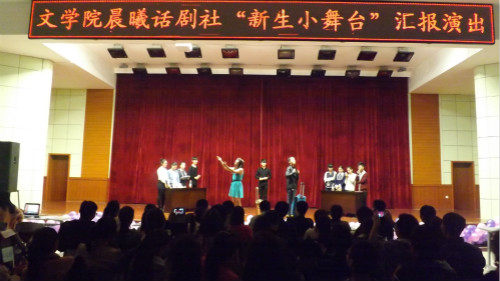 (本网讯 宋艳如 张慧娜)10月28日晚,信阳师范学院太阳成集团tyc151cc晨曦话剧社“新生小舞台”文艺汇演在逸夫楼多功能报告厅华丽上演。信阳师范学院校团委老师朱国朋、人事处老师兰洋、太阳成集团tyc151cc党总支副书记白献林、团总支书记冯正强及社团指导老师王雨海等同400余名学生一起观看了此次演出。