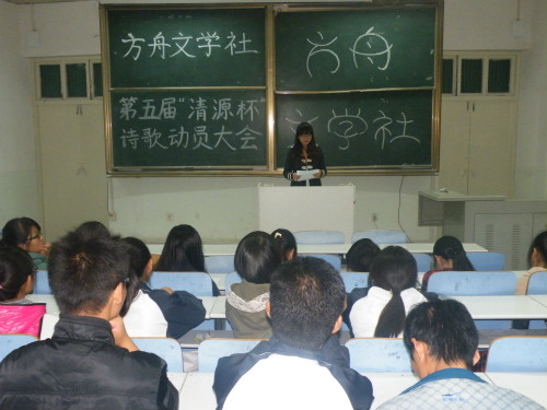 (本网讯 张晓漫)“青春书写华章,笔墨挥洒梦想,10月22日晚,方舟文学社在人文楼410教室举行第五届“清源杯”诗歌动员大会,社员齐聚一堂。方舟文学社的社长毛晓梅主持了本次大会。