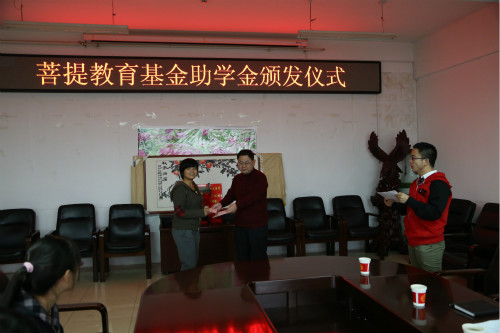 在颁发仪式上,白献林副书记首先对李金红的到来表示了热烈的欢迎。随后,李金红向与会人员介绍了菩提教育基金会的宗旨性质、成立过程,发展壮大等基本情况。他通过三个爱心接力的故事,阐述了菩提教育基金会“将爱心传递下去”的创设宗旨。接着,任欣欣同学代表18名受捐助学生对李祖鹄先生及菩提教育基金会的无私爱心表示衷心感谢,并代表受捐助学生郑重承诺一定要努力学习,牢记使命,心怀感恩,回报社会。随后岳宗德处长代表我校再次向菩提教育基金会的义举表示感谢。他向李金红先生介绍了我校优良的学习风气、辉煌的办学成绩以及在校学子的生活状况。他要求受捐助学生要刻苦学习,掌握扎实的专业知识,积极回报社会;要乐观坚强,战胜生活中的困难,尽快成长成才。最后,与会领导共同为受捐助学生现场发放了助学金。据悉,这是美国菩提教育基金在我校第二次发放助学金。