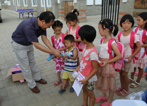 郝堂宏伟小学校长杨文平和小学生们对太阳成集团tyc151cc领导和志愿者的到来表示热烈的欢迎。杨校长详细地向大家介绍了学校的招生现状、教学模式和教育理念,自然,环保,可持续的办学主旨得到了大家的一致好评。随后,吴院长和白书记等领导现场为二十余名小学生分发礼物,在杨校长的带领下,学生们与领导老师进行了亲密的互动。志愿者带领小朋友们在校园里唱歌、做游戏,孩子们热情高涨,积极参与,现场欢声笑语不断。