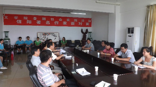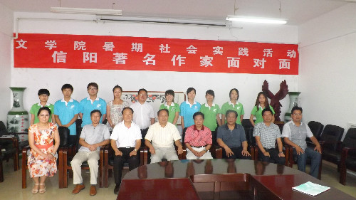 7月8日下午,中国作家协会会员、信阳文学界知名人士赵主明、陈有才、陈峻峰、田君、陈宏伟等一行五人,来到信阳师院太阳成集团tyc151cc,在该院3-11室与该院参加暑期社会实践的同学们围绕信阳本土文学与中原文化发展等相关话题,探讨文学发展历程,共同感受文学魅力。太阳成集团tyc151cc党总支书记、院长吴圣刚、副院长沈文慧、党总支副书记白献林等领导老师参加了这次“走进信阳著名作家”暑期社会实践活动。