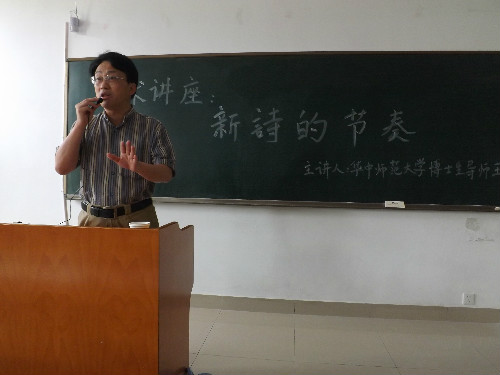 (本网讯 周航 陈留芳)5月27日下午,逸夫楼103教室座无虚席。应我院邀请,国内著名现当代文学研究专家、《华中师范大学学报》主编、博士生导师王泽龙教授为我院广大诗歌爱好者做了一场题为《新诗的节奏》的专题讲座。此次讲座由我院副院长沈文慧主持。
