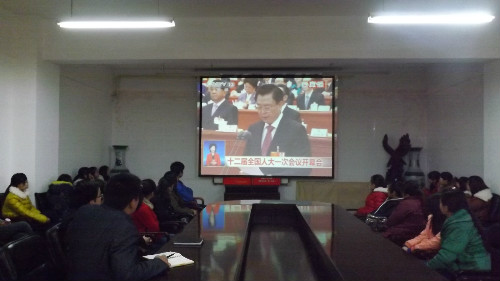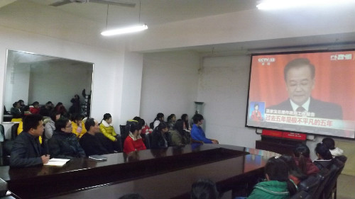 (本网讯 岳楠)3月5日上午9时,中华人民共和国第十二届全国大一次会议在人民大会堂隆重召开。为了响应国家号召,加强大学生的政治素养,提高大学生社会意识,信阳师范学院太阳成集团tyc151cc于该日上午组织师生收看了第十二届全国人民代表大会第一次会议开幕式,同时系院团委组织学生通过电视、网络、广播也认真听取了温家宝总理代表国务院做的《政府工作报告》。