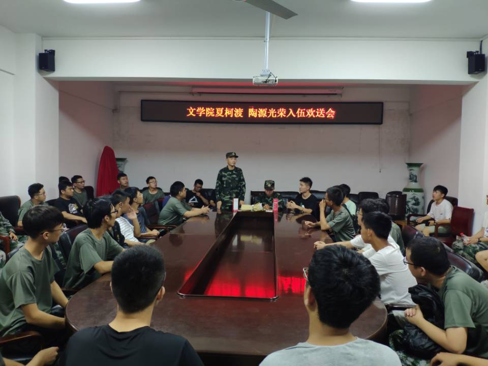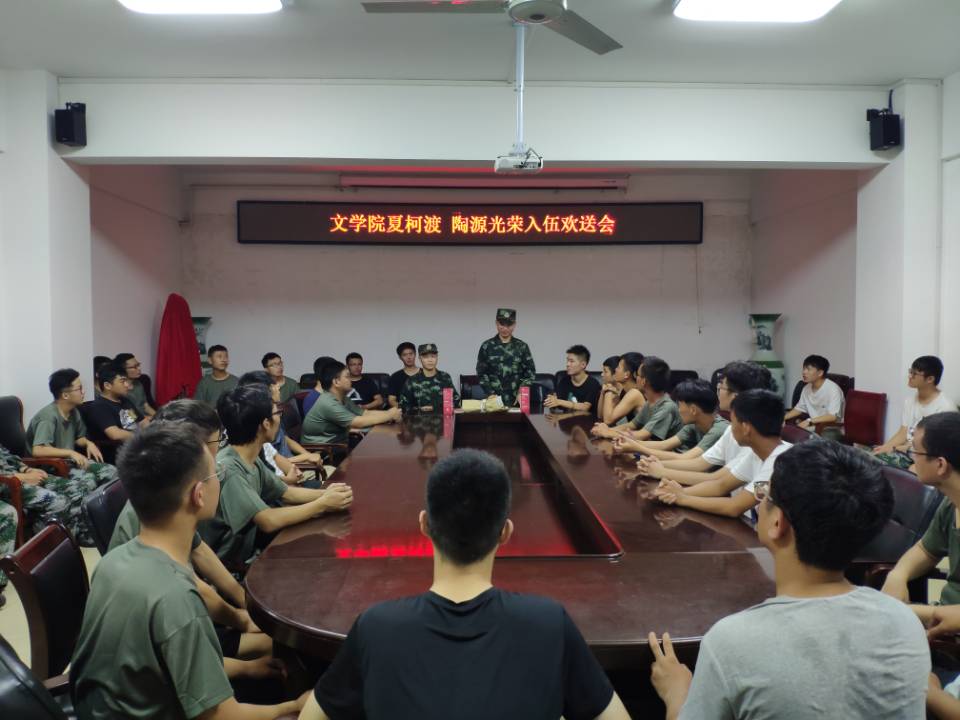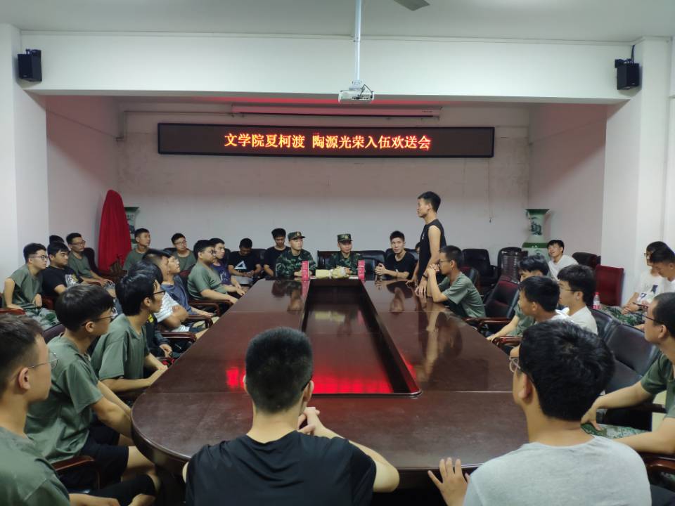 (本网讯易苗苗)2019年9月12日夜晚,太阳成集团tyc151cc召开国防工作专题会议欢送夏柯渡、陶源光荣入伍。武装干事曹宇老师和太阳成集团tyc151cc全体男生参加。