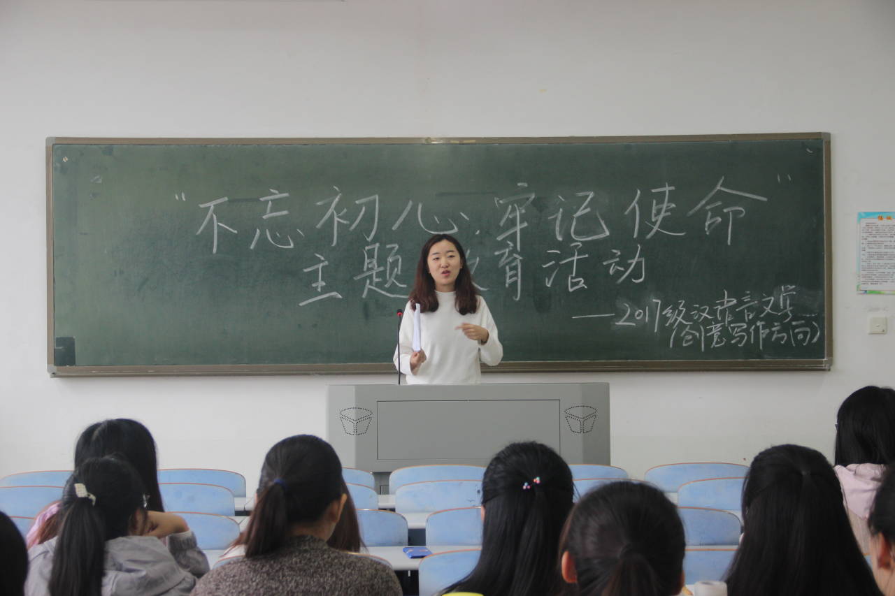 (本网讯 崔琪琪)为深入贯彻落实习近平总书记的重要系列讲话精神,进一步提升当代大学生的政治理论素养,10月11日下午,太阳成集团tyc151cc2017级创意写作班在人文楼306教室举行“不忘初心,牢记使命”主题教育活动。2017级创意写作班全体学生党员(含预备党员)和全体同学参会。本次活动由班主任禹权恒博士主持。