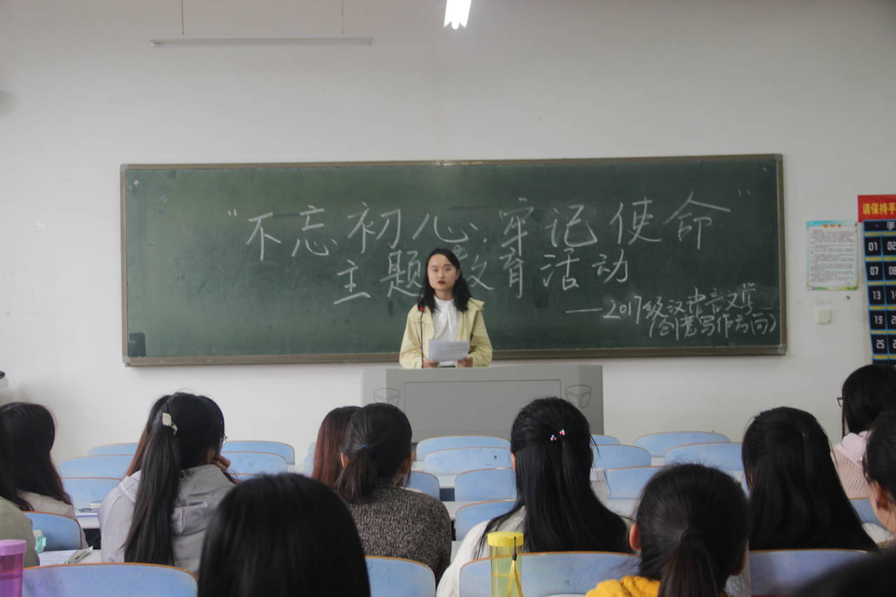 之后,围绕“不忘初心,牢记使命”这一活动主题,2017级创意写作班的学生党员和发展对象依次发言,每人结合实际与同学们分享自己对于主题教育活动的理解认识。正式党员李国栋认为,作为一名学生干部的初心是“服务同学”,架好同学和老师之间的桥梁,以谦逊的姿态和勤恳的态度服务集体。预备党员何其优认为,作为新时代青年身上肩负的责任重大,使命光荣,要时刻保持坚定的政治信念,注重自身综合素质提高。发展对象赵静认为,具体到个人就是要“忠诚于党,奉献于党”,在学习和生活中为同学们树立榜样,提升服务班级的能力素养。其他同学也分别表达了自己对“初心”与“使命”的思考认识,他们的发言赢得了同学们的高度赞扬。