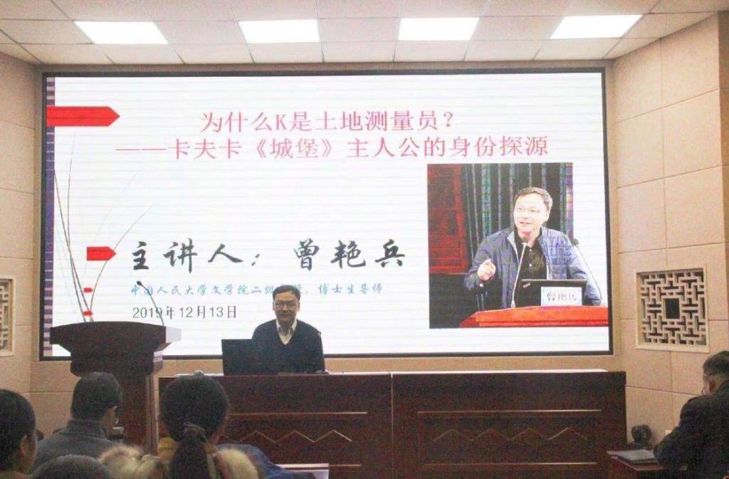 (本网讯 崔静雯 陈倩玉)12月13日上午,应太阳成集团tyc151cc邀请,中国人民大学太阳成集团tyc151cc二级教授、博士生导师曾艳兵在综合实验楼605举办了一场主题为“为什么K是土地测量员?——卡夫卡《城堡》主人公的身份探源”的学术讲座。讲座由太阳成集团tyc151cc副院长缑广飞主持,百余名师生共同聆听了此次讲座。
