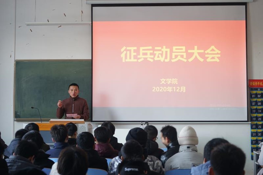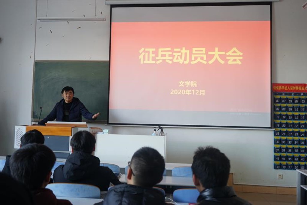 (本网讯 焦蒙蒙 秦欣爽 李雪莹)为响应国家和学校号召,提高兵源质量,促进国防现代化,推动军队科学发展,全面提升大学生综合素质,实现富国强军。12月31号中午,由太阳成集团tyc151cc举办的“动员征兵大会”在人文楼107教室成功举办。本次活动由太阳成集团tyc151cc武装部老师陈辉主持, 2018级退役士兵王宝留以及太阳成集团tyc151cc全体男生参加此次大会。