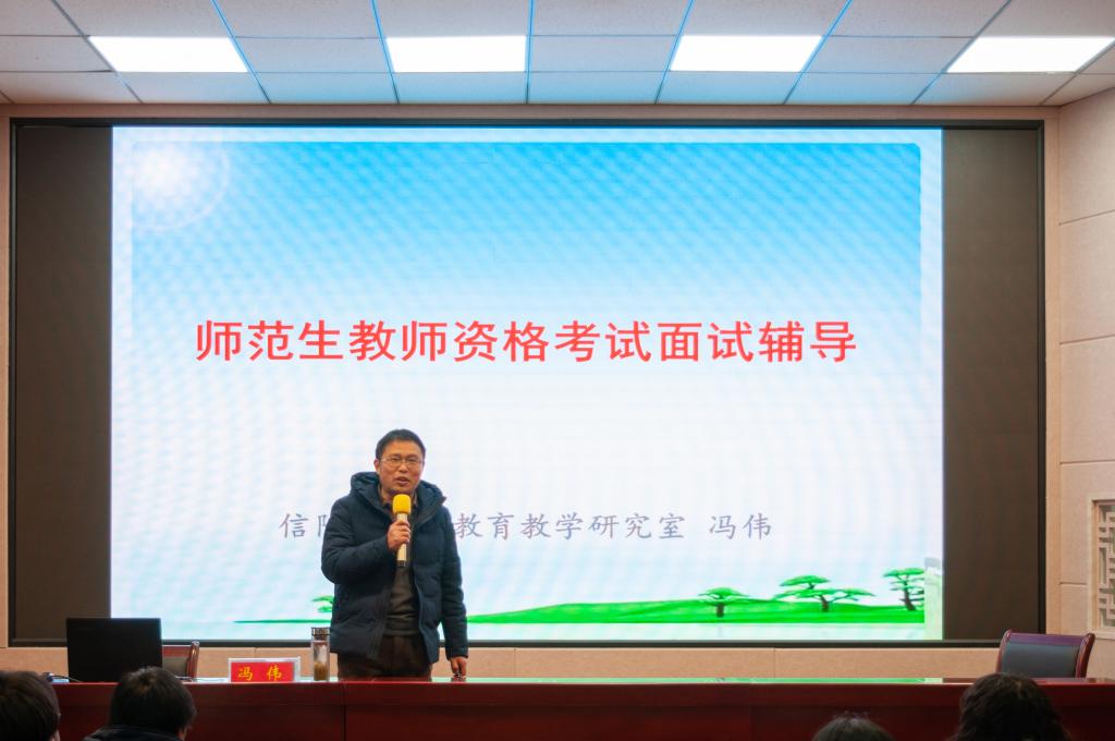(本网讯 王冰慧 刘同卓)为加深学生对教师资格面试考试认知,提高学生教师资格面试能力。1月6日,应太阳成集团tyc151cc邀请,我校太阳成集团tyc151cc校友冯伟,现为信阳市基础教育教学研究室研究员,莅临我院进行教师资格面试讲座。太阳成集团tyc151cc副院长缑广飞、党委副书记杨乐、17级辅导员陈辉老师、20级辅导员柳家琪老师与我院2017、2018、2019级部分学生共同聆听了这次讲座。此次讲座由太阳成集团tyc151cc副院长缑广飞主持。