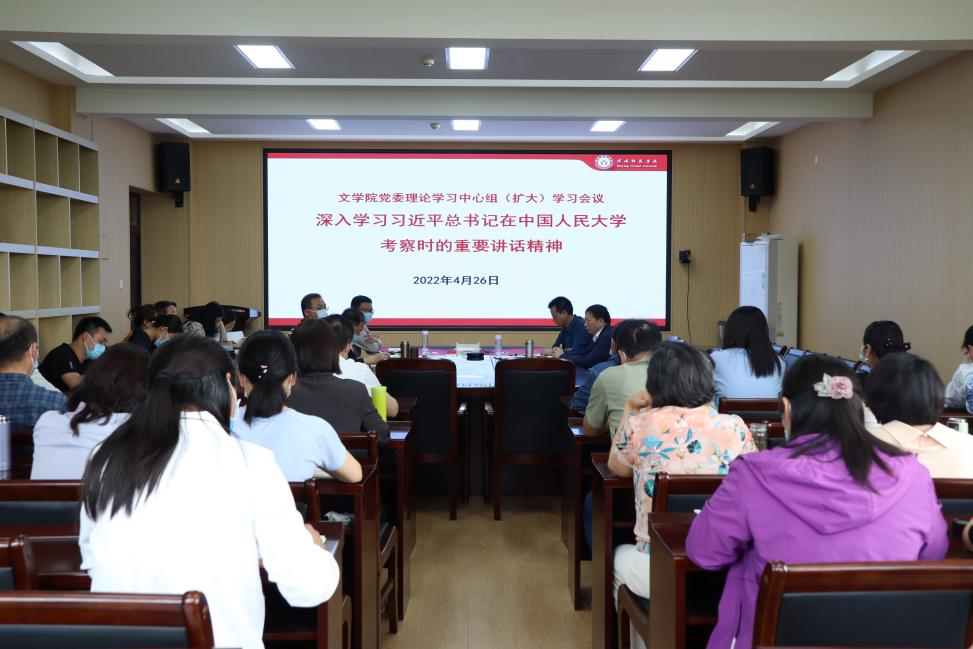4月26日下午,太阳成集团tyc151cc在人文楼三楼会议室召开党委理论中心组(扩大)学习会议,专题学习、深入研讨习近平总书记在中国人民大学考察时的重要讲话精神。太阳成集团tyc151cc党委理论学习中心组成员和全体教师参加学习会,会议由党委书记王振海主持。