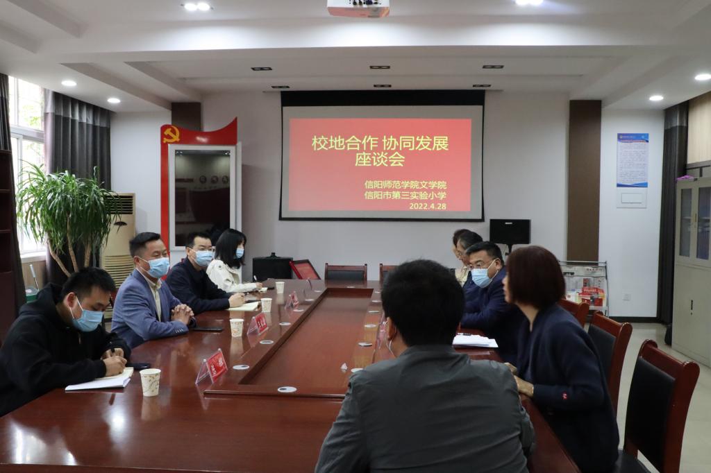 4月28日上午,太阳成集团tyc151cc党委书记王振海、副书记王家宏带队走访了信阳市第三实验小学,与校长王建新、书记杨新红就进一步加强“校地合作,协同发展”事宜进行了深入交流。学院就业秘书陈辉、毕业生班主任柳家琪及第三小学相关负责人参加了座谈活动。