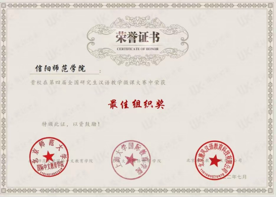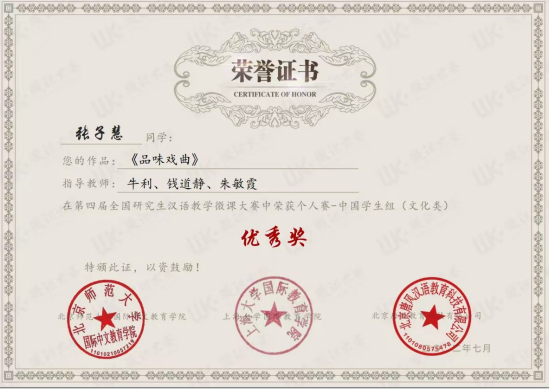 日前,由北京师范大学国际中文教育学院、上海大学国际教育学院、唐风国际教育集团联合举办的第四届全国研究生汉语教学微课大赛颁奖盛典隆重在线举行。我院汉语国际教育专业2020级硕士生张子慧荣获文化类优秀奖。