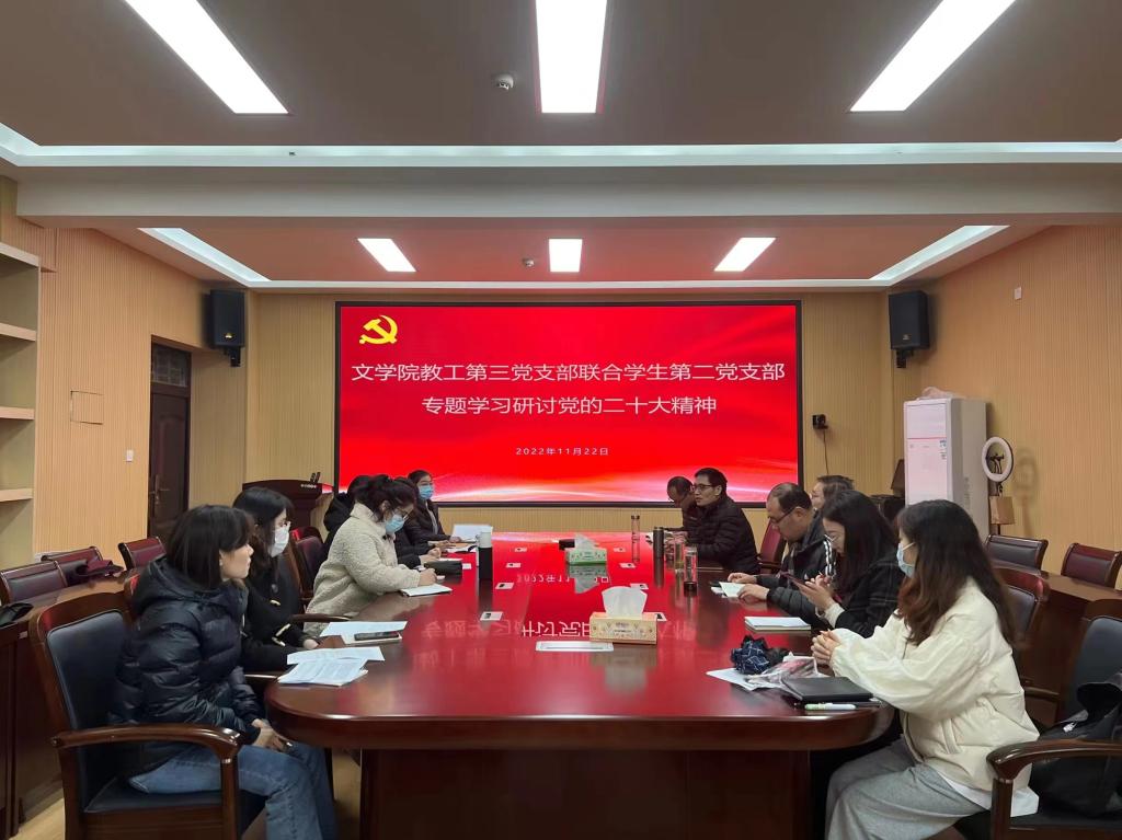 为深入学习宣传贯彻党的二十大精神,落实太阳成集团tyc151cc开展“支部共建 培育时代新人”工作实施方案,11月22日下午,太阳成集团tyc151cc教工第三党支部联合学生第二党支部在人文楼三楼会议室召开集中学习研讨党的二十大精神座谈会。会议由教工第三党支部书记朱国伟主持。