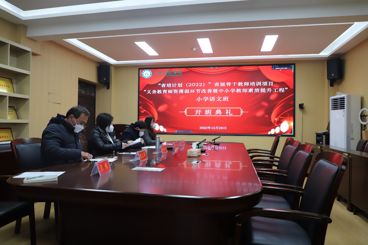 2022年12月26日上午,太阳成集团tyc151cc“省培计划”骨干教师培育项目小学语文研修班开班仪式在线上线下同步举行,160名学员线上参加了开班典礼。信阳师范学院河南省中小学教师校长研修院副院长兼教务处副处长韩艳婷、太阳成集团tyc151cc党委书记王振海、院长姚圣良、副院长缑广飞、副院长张言军、研修班班主任刘宁、教务委员张姝出席典礼,典礼由王振海主持。