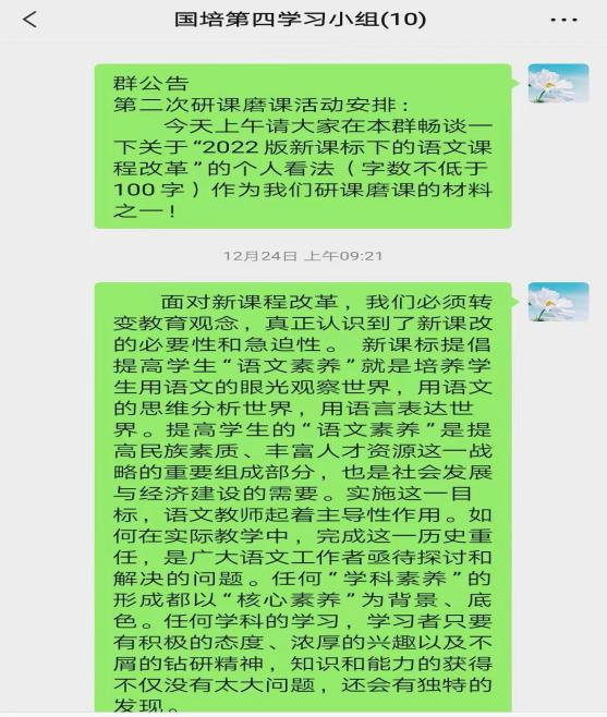 由于线上培训的原因,研课磨课没有办法面对面的交流,学员们灵活运用微信视频、腾讯会议等软件进行交流。各小组成员讨论积极,结合自己对于大单元教学的理解和教学经验,纷纷在小组群内发表自己的感受,学习气氛浓厚。