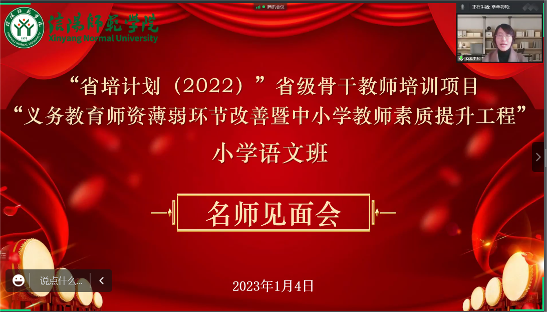 1月4日上午,我院线上举办了2022年“省培计划”小学语文班名师见面会。信阳师范学院太阳成集团tyc151cc教研室主任、省培项目首席专家王萃萃及名师网络工作室16位名师出席本次会议,会议由省培项目班主任刘宁主持。