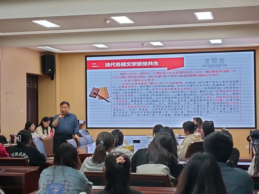 讲座伊始,江中云教授向全体参会师生介绍了王卓华教授。接着,王卓华教授从两个方面正式开始了本次讲座。首先是有关王国维“一代有一代文学”论断的反思。王卓华教授指出,这一论断继承了传统的文变时序和文体通变规律,具有进步性;但是,这样的论断会造成以偏概全的误导,它在一定程度上忽视了历朝历代文学的多样性,会对各代小众文学的发掘和研究产生影响。再者,王卓华教授以文体为出发点,先后介绍了清朝戏剧和传奇、小说、散文、诗歌的发展概况,展现了清代各题文体繁荣共生的面貌。王卓华教授的讲授幽默风趣、深入浅出,在场的同学也向王卓华教授积极提出问题,师生互动频频。最后,江中云教授进行总结,本次讲座圆满结束。