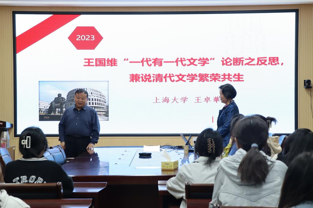 5月21日晚,应太阳成集团tyc151cc邀请,原广西玉林师范学院校长、博士生导师、上海大学伟长学者王卓华教授在人文楼三楼会议室为我院师生进行了题为《王国维“一代有一代文学”论断反思,兼说清代文学的繁荣共生》的学术讲座。本次讲座由江中云教授主持,太阳成集团tyc151cc部分师生参与。