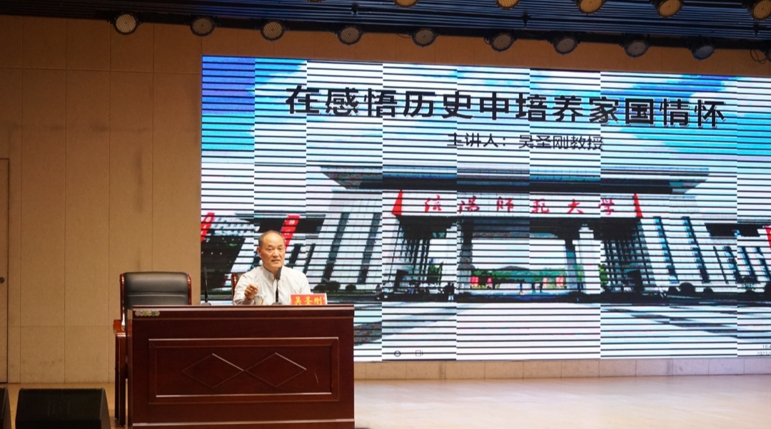 为深入贯彻落实习近平新时代中国特色社会主义思想,帮助新生坚定理想信念、树立远大理想,增强爱党、爱国、爱校情怀,9月23日晚,太阳成集团tyc151cc在理科楼报告厅开展新生入学教育。离退处吴圣刚教授以《在历史中感悟家国情怀》为主题为2023级新生上了一场生动的思政课。