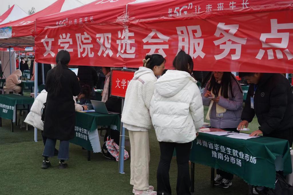 11月25日,河南省毕业生就业市场豫南分市场暨suncitygroup太阳成集团2024届毕业生冬季双向选择洽谈会在西操举行。党委副书记王家宏、辅导员柳家琪莅临现场,指导毕业生做好就业工作。