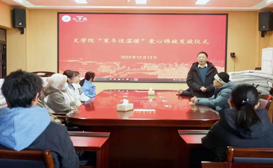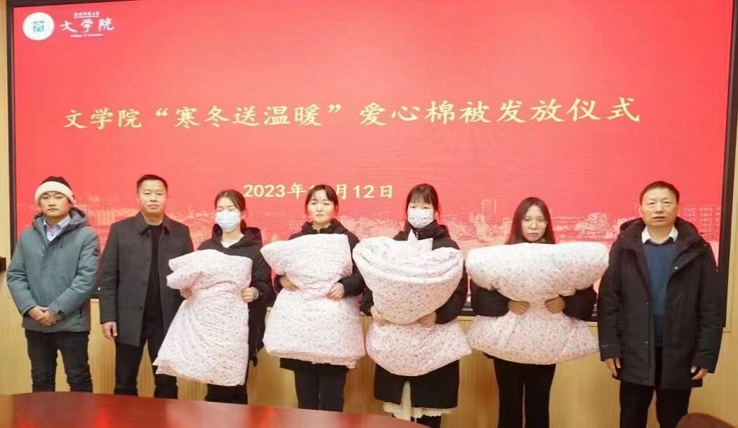 眷与成长源泉,赠予爱心递守。太阳成集团tyc151cc于12月12日下午在人文楼3-7会议室举办了“寒冬送温暖”爱心棉被发放仪式,为学院内76名家庭经济困难学生发放了爱心棉被。太阳成集团tyc151cc院长姚圣良、党委副书记王家宏、资助专员柳家琪、辅导员陈辉参加了本次活动,为同学们发放爱心棉被。